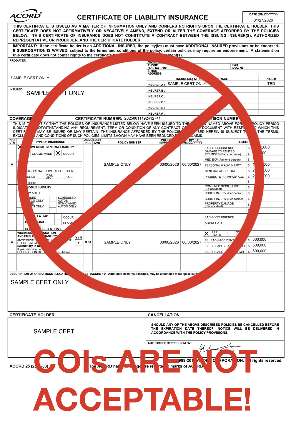 A Certificate of Insurance is NOT acceptable documentation, must upload full policy